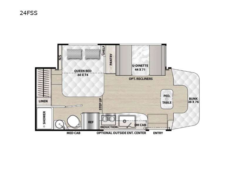 With extra space from the full-wall slide, you'll love spending time in this Prism Select Class C diesel motorhome! You can bring along the whole gang because the RV queen bed, the dinette, and 45" x 80" bunk above the cab will provide plenty of sleeping space, and the ample storage will be very helpful for everyone's belongings. You can also stock up on some treats and goodies with the pantry slide out, and the full bathroom is a great convenience to have whenever you need to get cleaned up. Plus, there is an optional outside entertainment center that can be added and the dinette can be switched out for optional recliners!